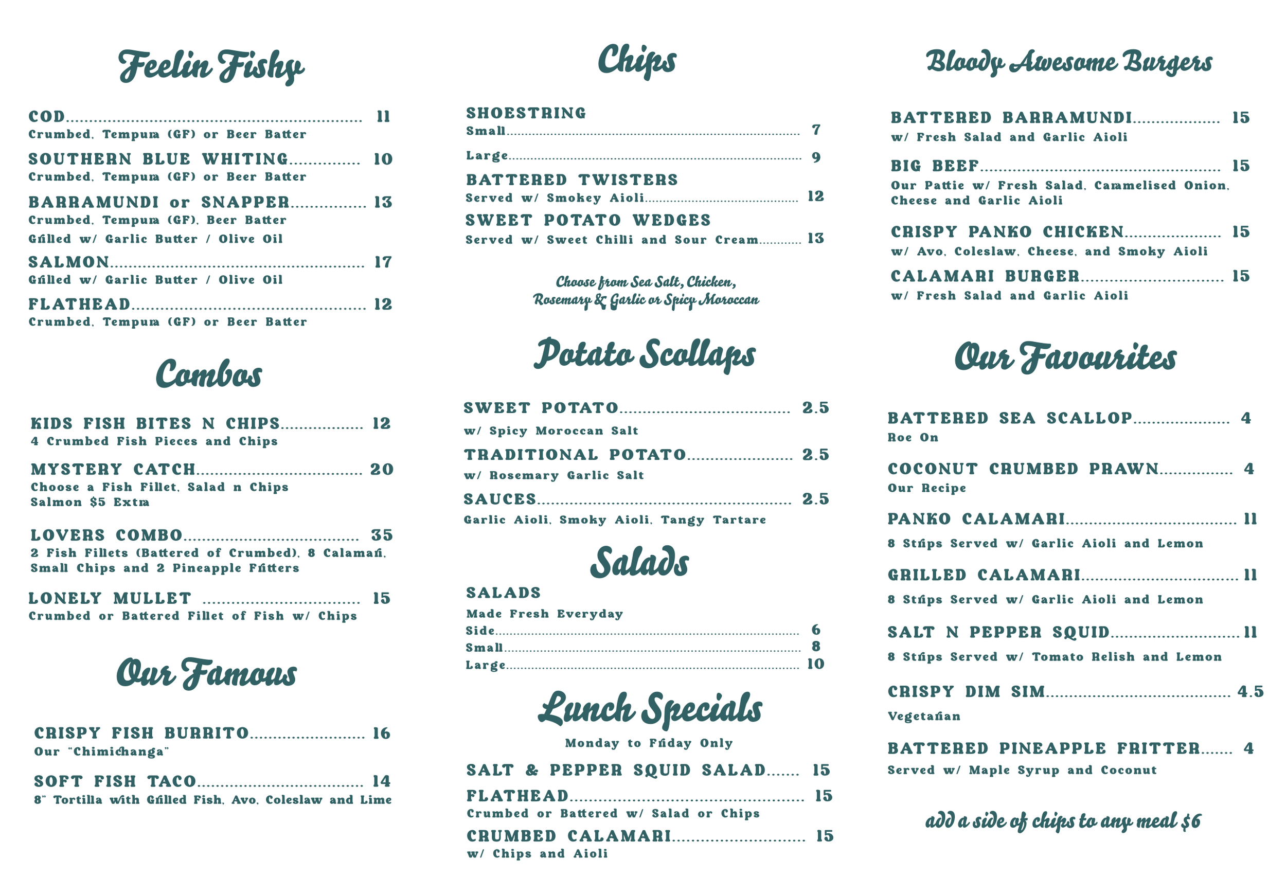 Lindy and Bruce decided to open a 'healthy options' fish and chips cafe in 2010 where customers could enjoy fish and chips but with a healthy twist. All of our menu items are freshly prepared daily by our chefs including, salads which ingredients are bought from local farmers, our own designed sauces, fresh smoothies and real potato scallops. We don't believe in making food that wont make you feel good and none of our menu items are pre made or bought in ! We fillet our fish daily and cook your selected anyway you like it. We cater for gluten free and vegetarians allowing you to experience a classic fish and chips without guilt.